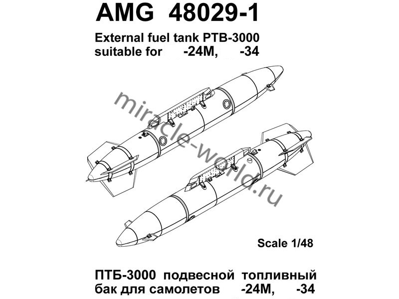 Дополнение для сборных моделей авиации Подвесной топливный бак ПТБ-3000 с балочным держателем БД4-УСК (в комплекте два бака + балочные держатели + декаль) в масштабе 1/48 от фирмы AMigo models (артикул 48029-1).