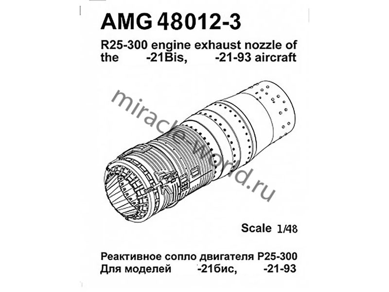 Подходит для моделей Самолет (М) тип 21бис / Самолет (М) тип 21-93. В комплект входят детали реактивного сопла, форсажной трубы, стабилизатора пламени и фронтального устройства.