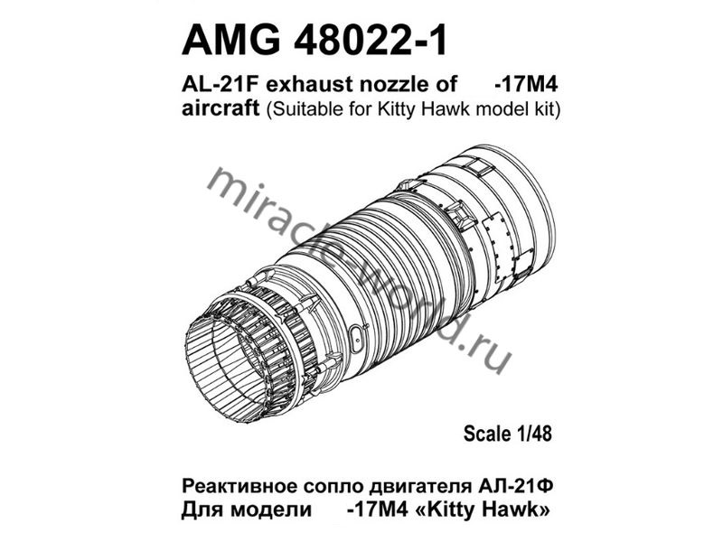 Подходит для моделей Самолет (С) тип 17М. Включает в себя детали регулируемого сопла, форсажной камеры и стабилизатора пламени. Рекомендуется для моделей "Kitty Hawk", "Zimi Model".