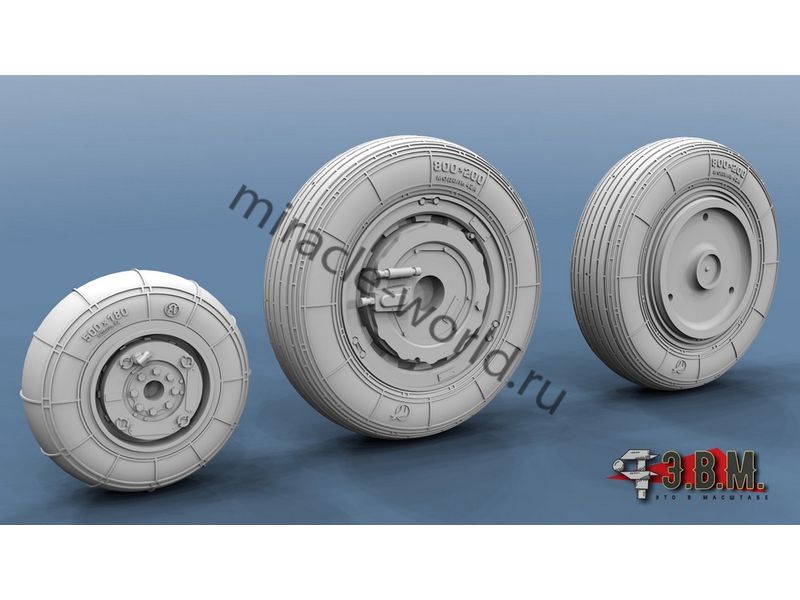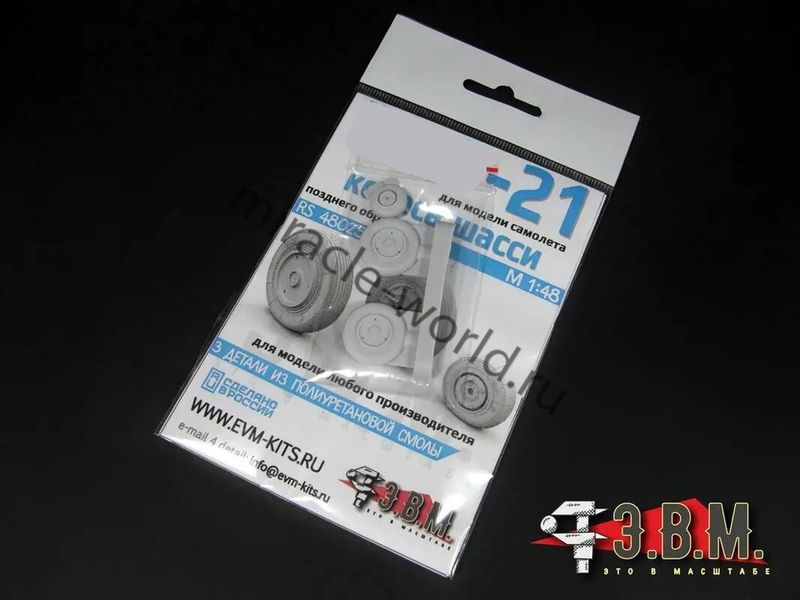 RS48025 Колеса шасси самолета МиГ-21 тип-2 (поздние). Масштаб 1/48. Набор комплектуется смоляными колесами с имитацией нагрузки и окрасочными масками.