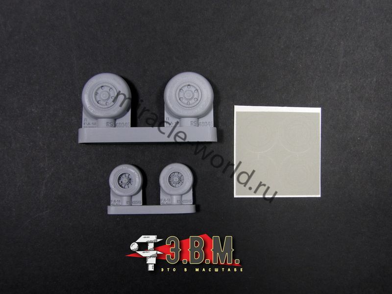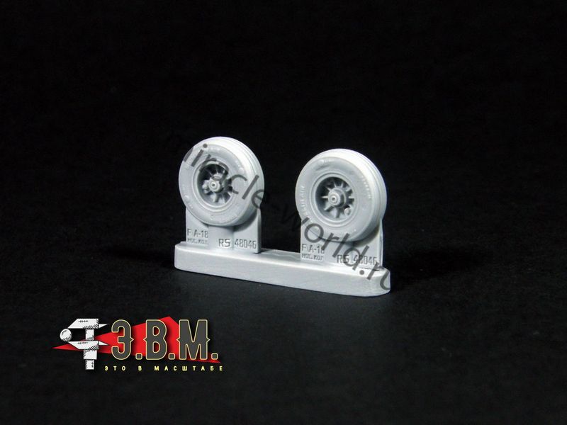 RS48046 Колеса шасси F\A-18 Super Hornet. Масштаб 1/48. Набор комплектуется смоляными колесами с имитацией нагрузки и окрасочными масками.