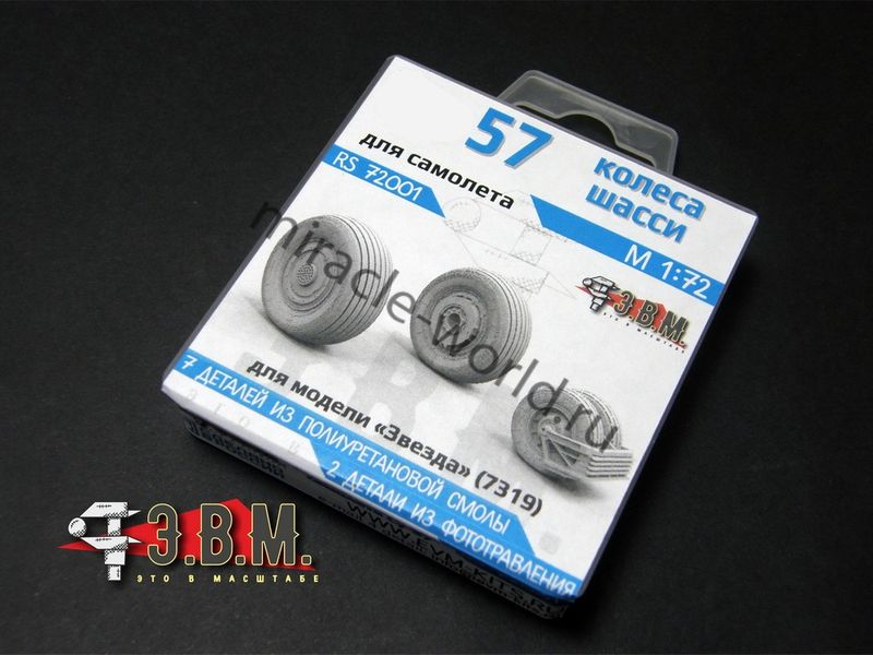 RS72001 Колеса шасси самолета Су-57. Масштаб 1/72. Набор колес шасси для модели самолета Су-57 в масштабе 1:72 производства "Звезда" (арт. 7319). Набор может так же быть использован при доработке Су-57 от других производителей. Материал: полиуретановая смола, латунь. Применимость: "Звезда" (арт. 7319)/универсальный набор. Состав набора: основное колесо - 2 шт, носовое колесо - 2 шт, детали основных колес - 2 шт, щиток передней стойки - 1 шт, плата фототравления - 1 шт, окрасочная маска - 1 шт, инструкция - 1 шт.