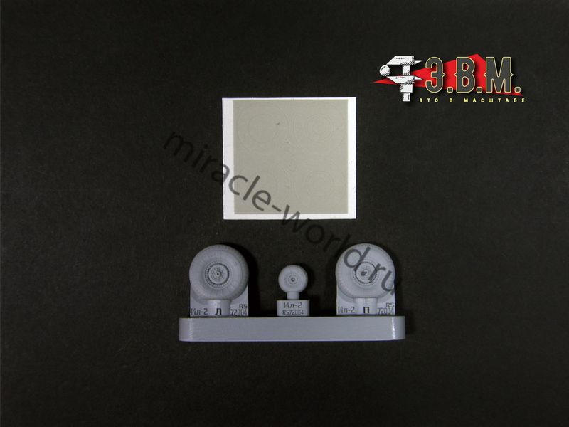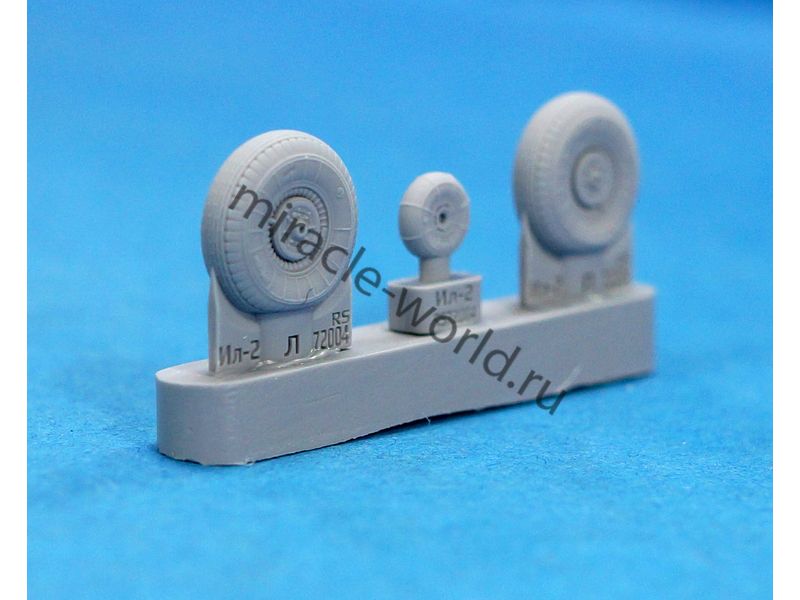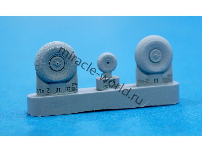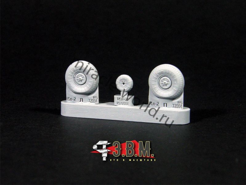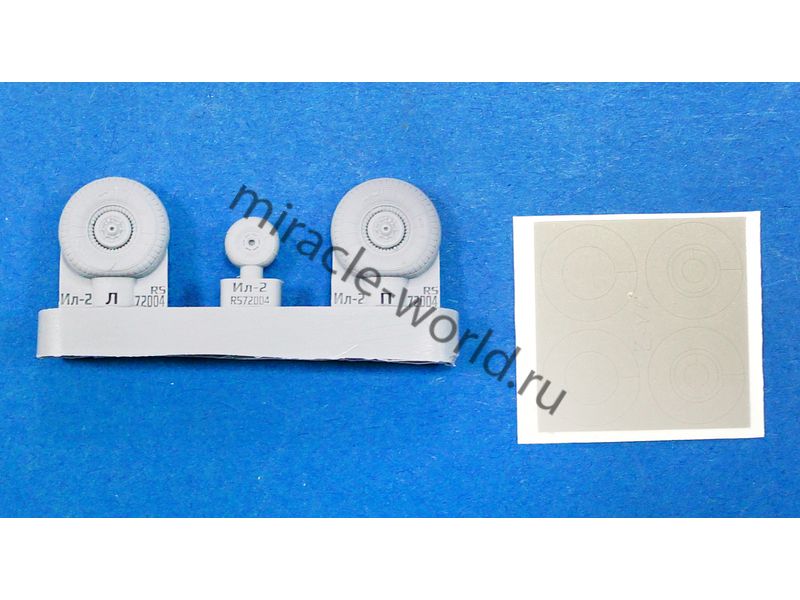RS72004 Колеса шасси самолета Ил-2. Масштаб 1/72. Набор комплектуется смоляными колесами с имитацией нагрузки и окрасочными масками.