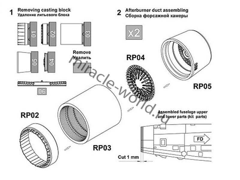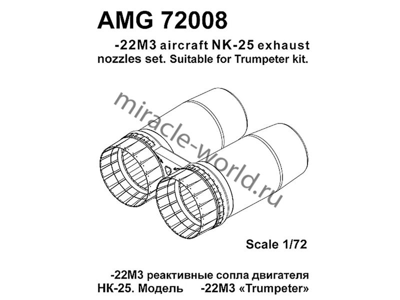 Подходит для моделей Самолет (Т) тип 22М3. В комплект входят детали реактивного сопла, форсажной трубы, стабилизатора пламени, фронтального устройства и хвостового шпангоута. Рекомендуется для моделей "Trumpeter".