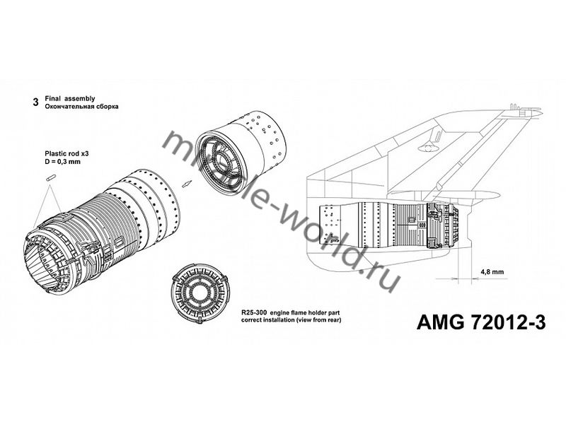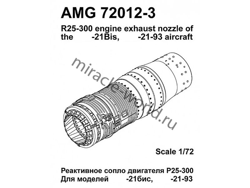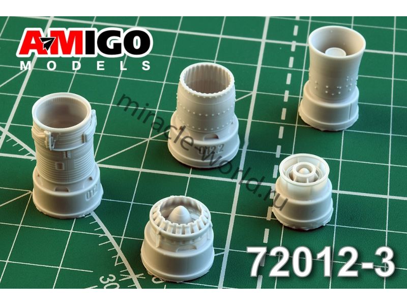 Подходит для моделей Самолет (М) тип 21бис, Самолет (М) тип 21-93. В комплект входят детали реактивного сопла, форсажной трубы, стабилизатора пламени и фронтального устройства.