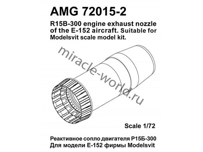 Подходит для моделей самолета Е-152. В комплект входят детали реактивного сопла, форсажной трубы, стабилизатора пламени и фронтального устройства. Рекомендуется для моделей "Modelsvit".