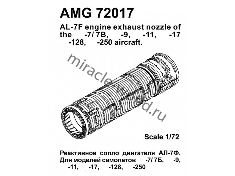 Подходит для моделей Самолет (С) тип 7, Самолет (С) тип 7Б, Самолет (С) тип 9, Самолет (С) тип 11, Самолет (Т) тип 128, Самолет (Л) тип 250. В комплект входят детали реактивного сопла, форсажной трубы, стабилизатора пламени и фронтального устройства. Рекомендуется для моделей "Amodel".