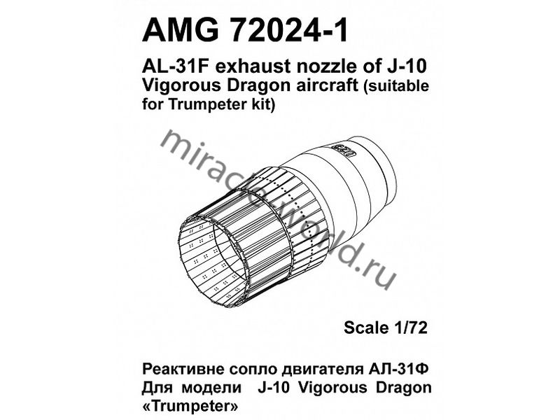 Подходит для моделей J-10 "Vigorous Dragon". В комплект входят детали реактивного сопла, форсажной камеры и стабилизатора пламени. Рекомендуется для моделей "Trumpeter".