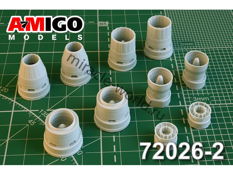 Дополнение для сборных моделей авиации Реактивное сопло двигателя АЛ-41Ф1С с УВТ (в комплекте два сопла со створками в закрытом и два сопла в полностью открытом положении) в масштабе 1/72 от фирмы AMigo models (артикул 72026-2).