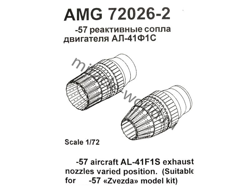 Подходит для моделей Самолет (С) тип 57. Набор позволяет имитировать реактивное сопло двигателя АЛ-41Ф1С в положении «МАЛЫЙ ГАЗ» и «ПОЛЁТНЫЙ МАЛЫЙ ГАЗ». В комплект входят детали реактивного сопла, форсажной трубы, стабилизатора пламени и фронтального устройства. Рекомендуется для моделей "Звезда".