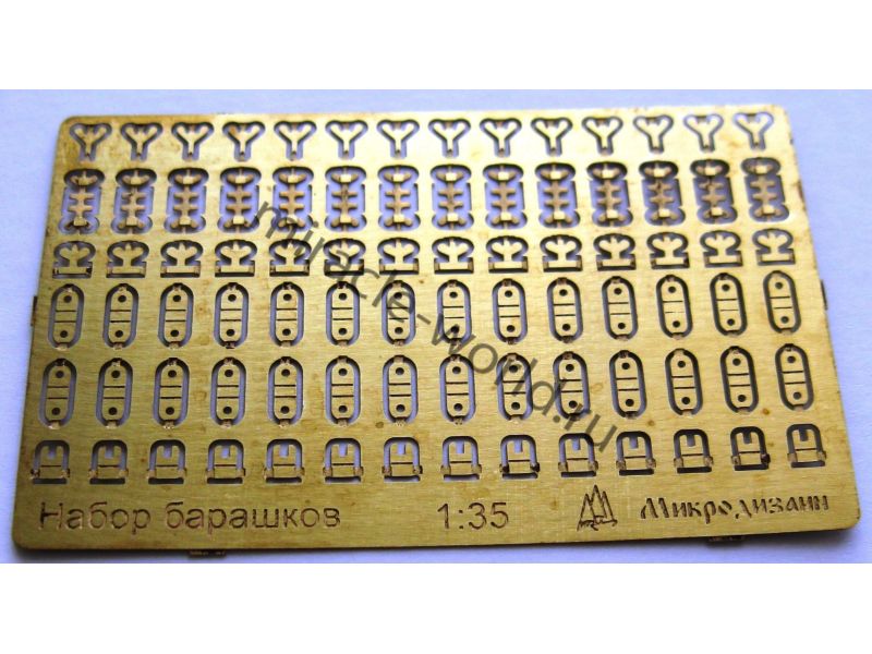 МД 035215 Набор "барашков" для БТТ. Масштаб 1:35. Материал: латунб 0,17 мм. Размер пластины 30 х 46 мм. В наборе 42 "барашка" трех различных конструкций и крепежи к ним.