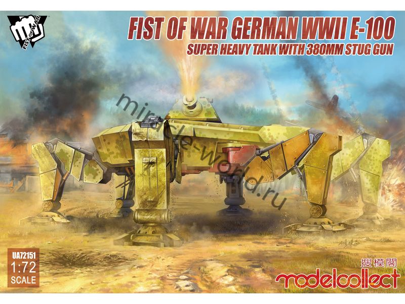 Сборная модель немецкого тяжелого шагающего танка Fist of War. German WWII E-100 Super Heavy Tank w/380mm Stug Gun в масштабе 1/72 от фирмы Modelcollect (артикул UA72151).