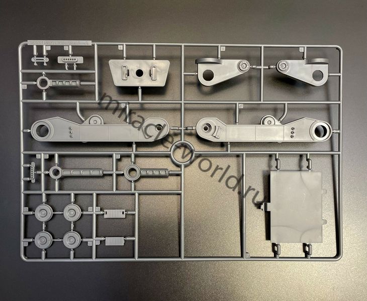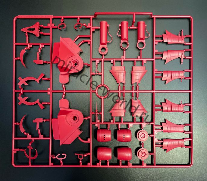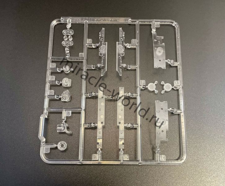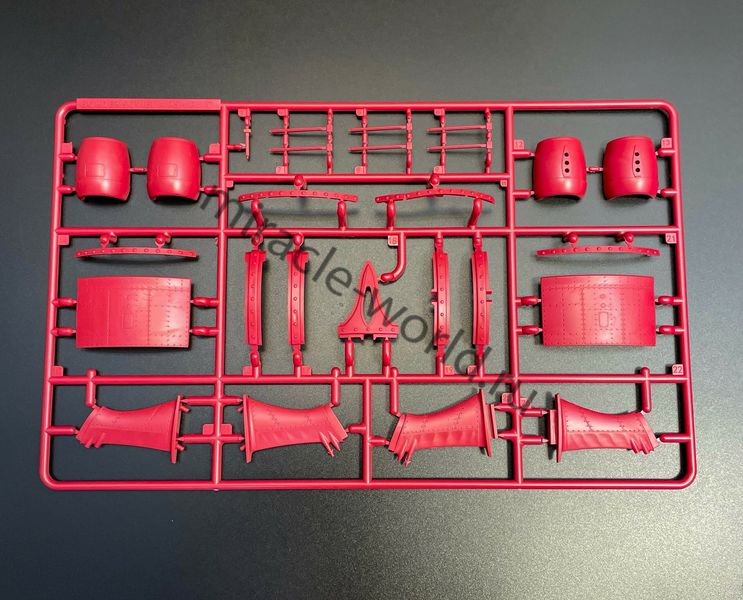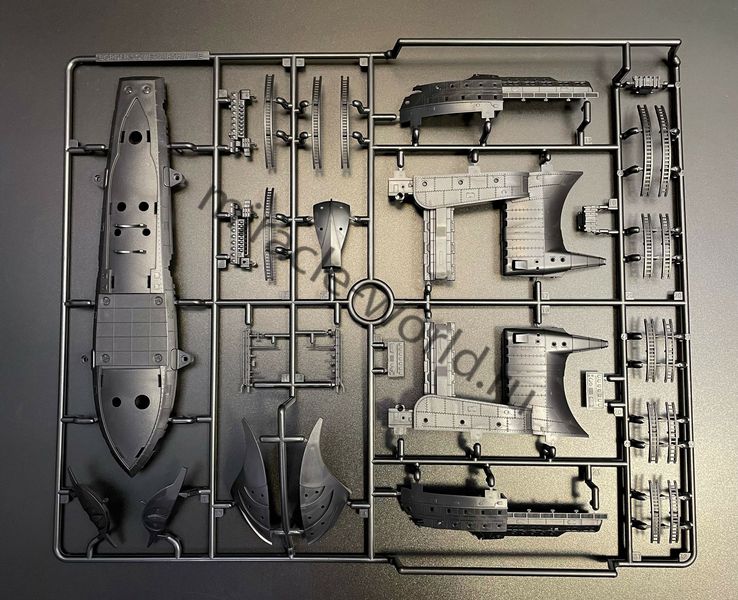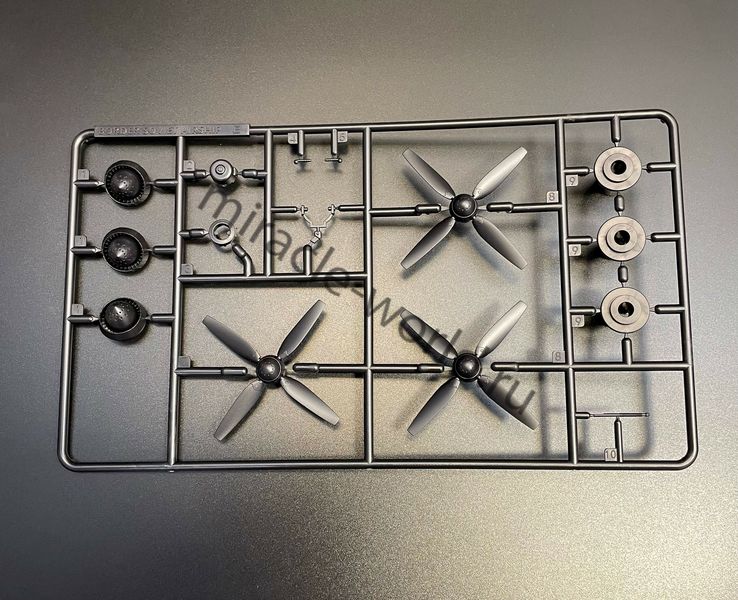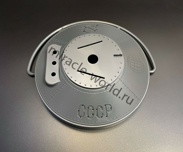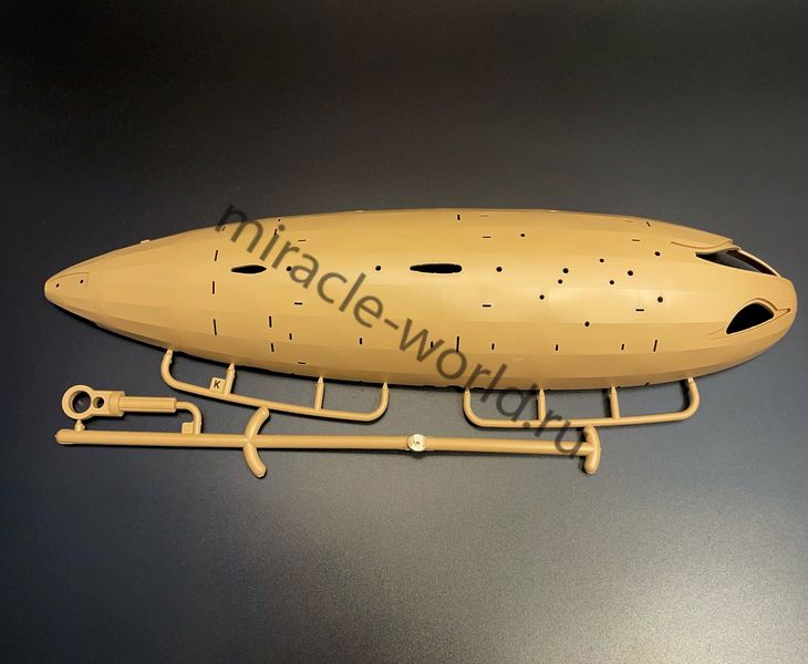 Цветной пластик, сборка без клея, светодиодная подсветка в комплекте. Пять электромоторов для вращения пропеллеров. Светодиодную подсветку с элементами стробоскопов БАНО, а также прожекторов. Уникальная винтажная подставка с имитацией гидравлических удерживающих устройств. Нижняя деталь постамента включает в себя батарейный блок с переключателями. Размер собранной модели, составит в длину: 400-мм.
