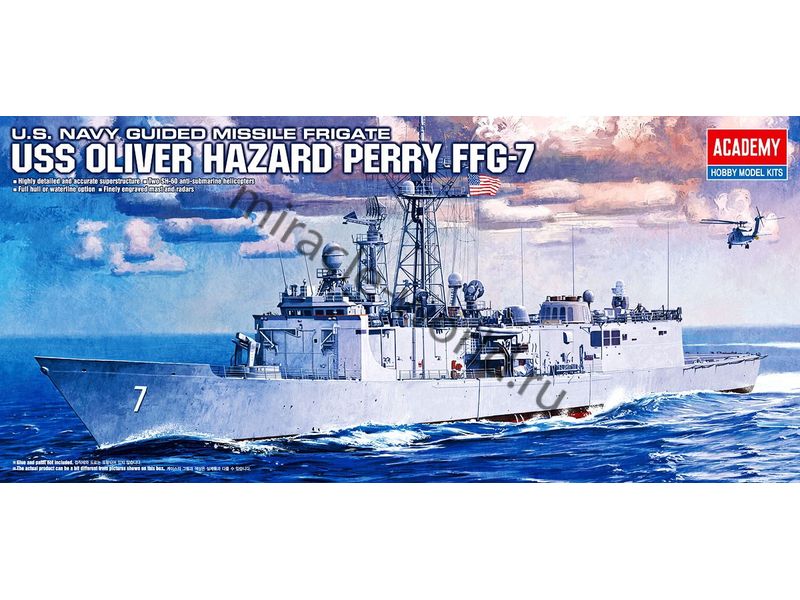 Сборная модель американского фрегата УРО (управляемого ракетного оружия) FFG-7 "Oliver Hazard Perry" в масштабе 1/350 от фирмы Academy (артикул 14102).
