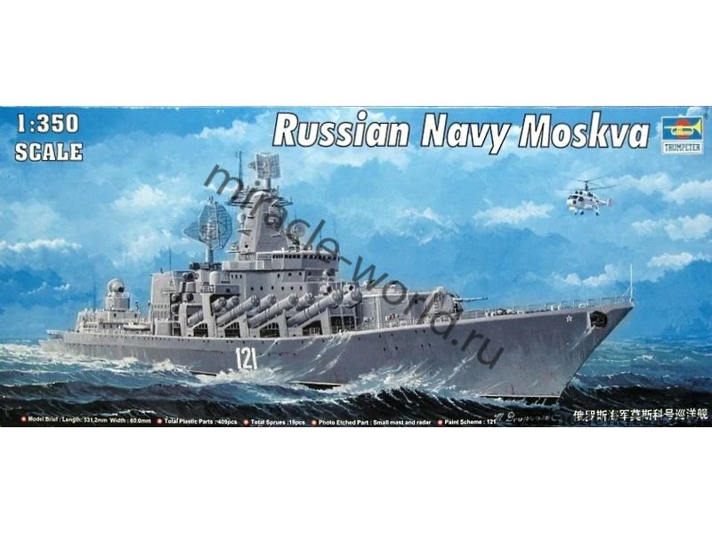 Сборная модель советского / российского ракетного крейсера "Москва" (ранее "Слава") проект 1164 "Атлант" в масштабе 1/350 от фирмы Trumpeter (артикул 04518).