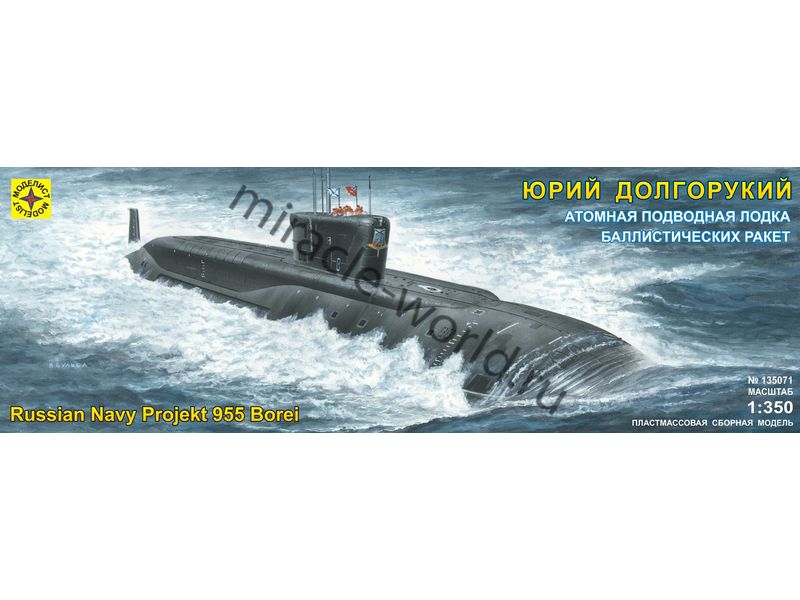 Сборная модель российской атомной подводной лодки стратегического назначения 4-го поколения "Юрий Долгорукий" проект 955 "Борей" в масштабе 1/350 от фирмы Моделист (артикул 135071).