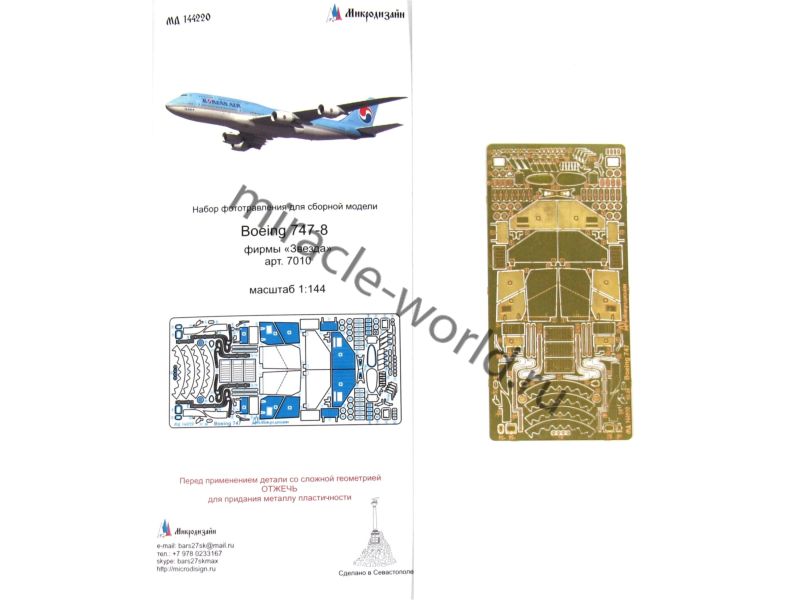 МД 144220 Набор фототравления для модели Boeing 747-8 от Звезды. Масштаб 1:144. Материал: латунь 0,17 мм. Количество уникальных деталей: 38 шт. Набор комплектуется платой фототравления и цветной инструкцией.