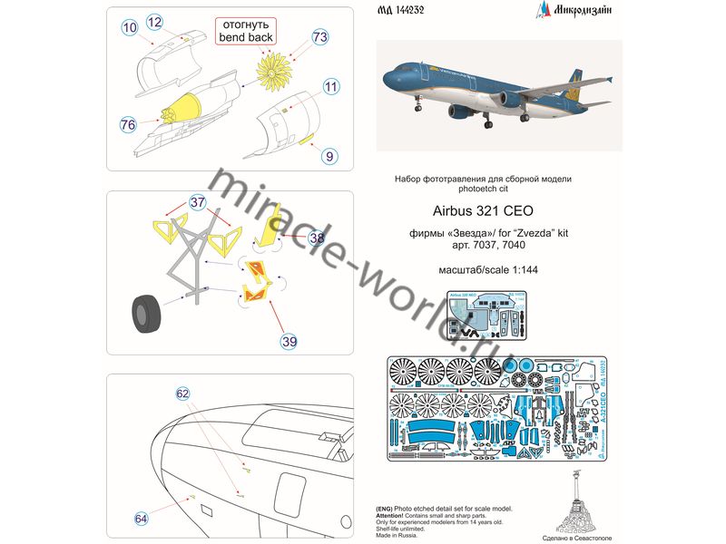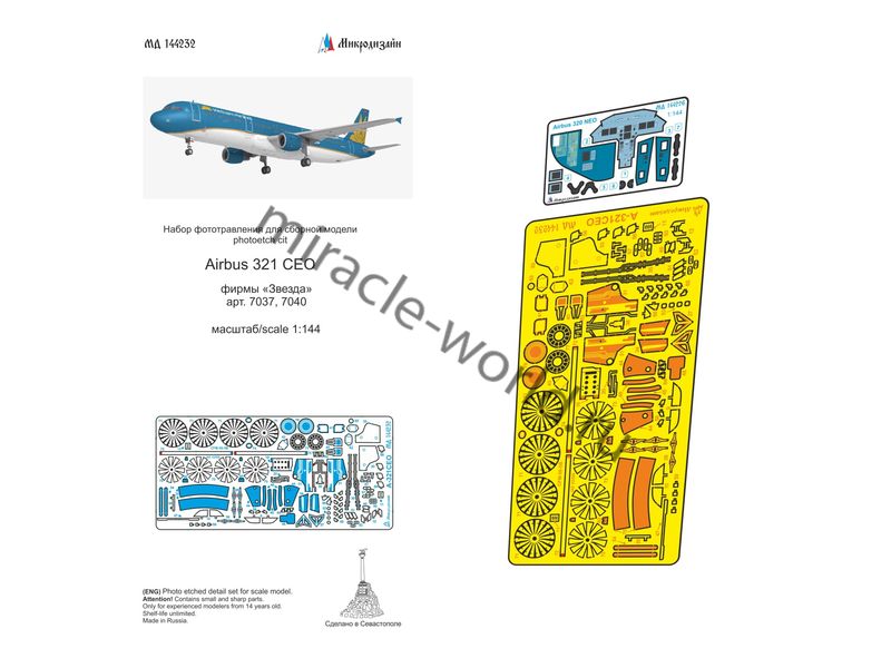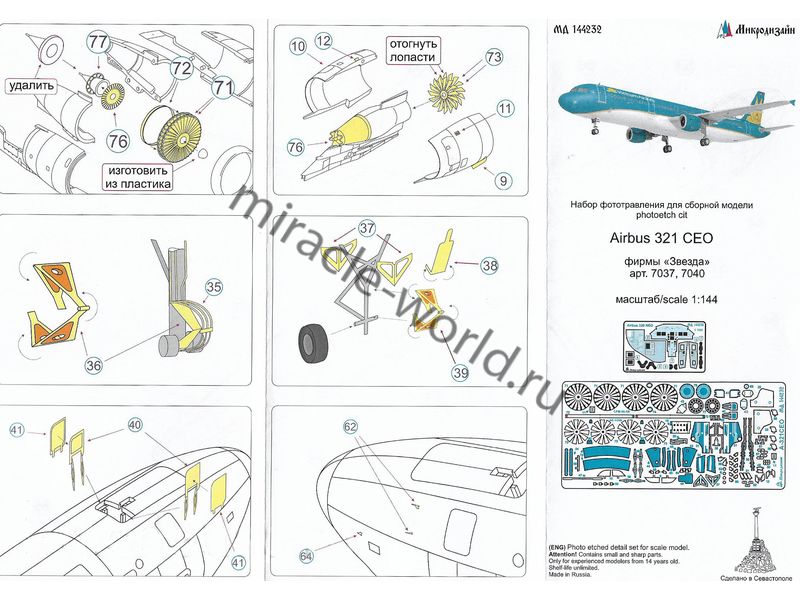 МД 144232 Набор фототравления для модели Airbus A-321 СEO от Звезды. Масштаб 1:144. Материал: латунь 0,15 мм. Количество уникальных деталей: 77 шт. Набор комплектуется 2 платами фототравления (цветная кабина пилота) и цветной инструкцией.