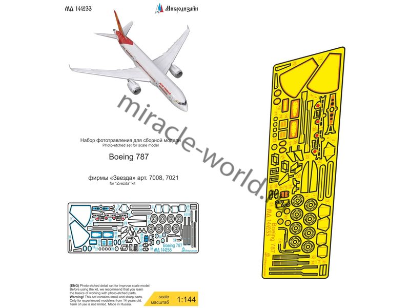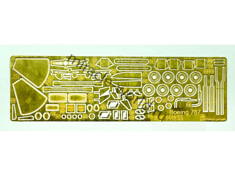 МД 144233 Набор фототравления для модели Boepng 787-8 от Звезды. Масштаб 1:144. Материал: латунь 0,15 мм. Количество уникальных деталей: 32 шт. Набор комплектуется платой фототравления и цветной инструкцией.