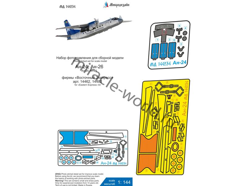 МД 144234 Набор фототравления для модели Ан-24 от Восточного Экспресса. Масштаб 1:144. Материал: латунь 0,15 мм. Количество уникальных деталей: 25 шт. Набор комплектуется 2 платами фототравления (цветная кабина пилота) и цветной инструкцией. Уровень сложности: начальный.