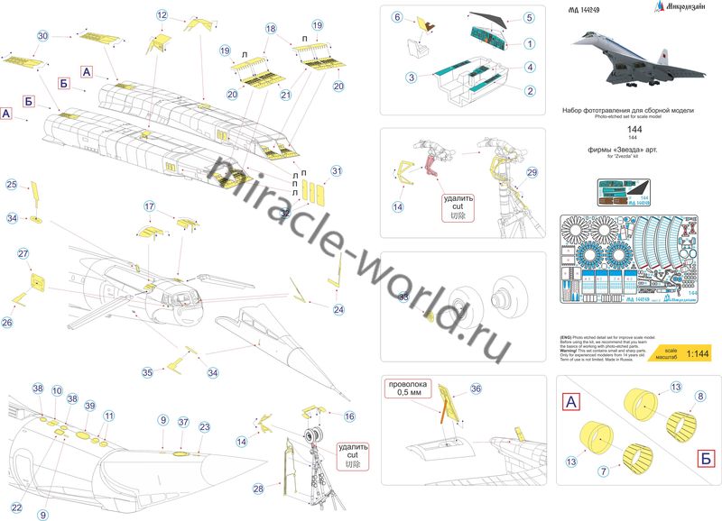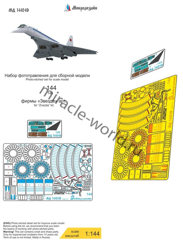 Микродизайн 144249 Набор фототравления для модели Ту-144 от Звезды. Масштаб 1:144. Материал: латунь 0,15 мм. Количество уникальных деталей: 39 шт. Набор комплектуется двумя платами фототравления (в том числе цветной платой приборных досок) и цветной инструкцией. Уровень сложности средний.