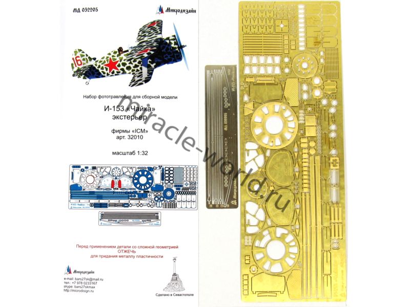 МД 032205 Набор фототравления для сборной модели И-153 "Чайка" (экстерьер) от ICM. Масштаб 1:32. Материал: латунь 0,17 мм, мельхиор 0,13 мм. Набор комплектуется 2 пластинами фототравления и цветной инструкцией. Количество уникальных деталей 74. Особенность набора: растяжки выполнены в мельхиоре, что придает им особую упругость и жесткость.Уровень сложности - средний.