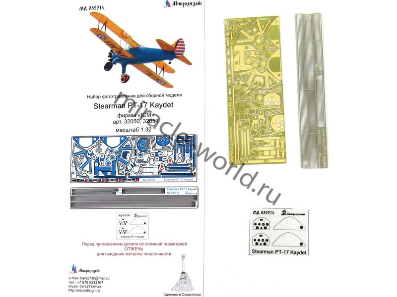 МД 032214 Набор фототравления для сборной модели Stearman PT-17 Kaydet от ICM. Масштаб 1:32. Материал: латунь 0,17 мм, мельхиор 0,12 мм. Набор комплектуется 2 пластинами фототравления и цветной инструкцией. Количество уникальных деталей 45. Уровень сложности - средний.