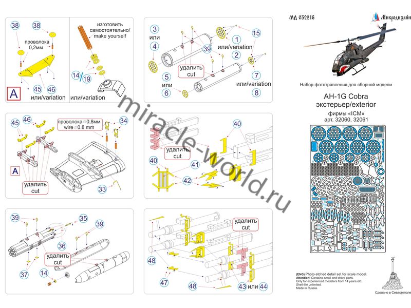 МД 032216 Набор фототравления экстерьера для сборной модели AH-1G Cobra от ICM. Масштаб 1:32. Материал: латунь 0,15 мм. Набор комплектуется пластиной фототравления и цветной инструкцией. Количество уникальных деталей 45. Уровень сложности - средний.
