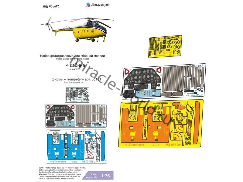 МД 035442 Набор фототравления на кабину вертолета М тип 4 от Trumpeter. Масштаб 1:35, Материал: латунь 0,17 мм, мельхиор 0,15 мм. Набор комплектуется 3 пластинами фототравления (в том числе пластиной объемных цветных приборных досок) и полноцветной инструкцией. Количество уникальных деталей 41. Уровень сложности: средний.