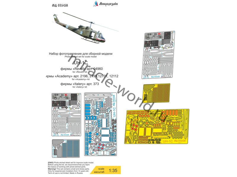 МД 035458 Набор фототравления на UH-1C от Revell, Academy. Масштаб 1:35. Материал: латунь 0,15 мм, мельхиор 0,15 мм. Набор комплектуется 3 пластинами фототравления (в том числе пластиной цветного объемного травления досок и ремней) и полноцветной инструкцией. Количество уникальных деталей 96. Уровень сложности: высокий.