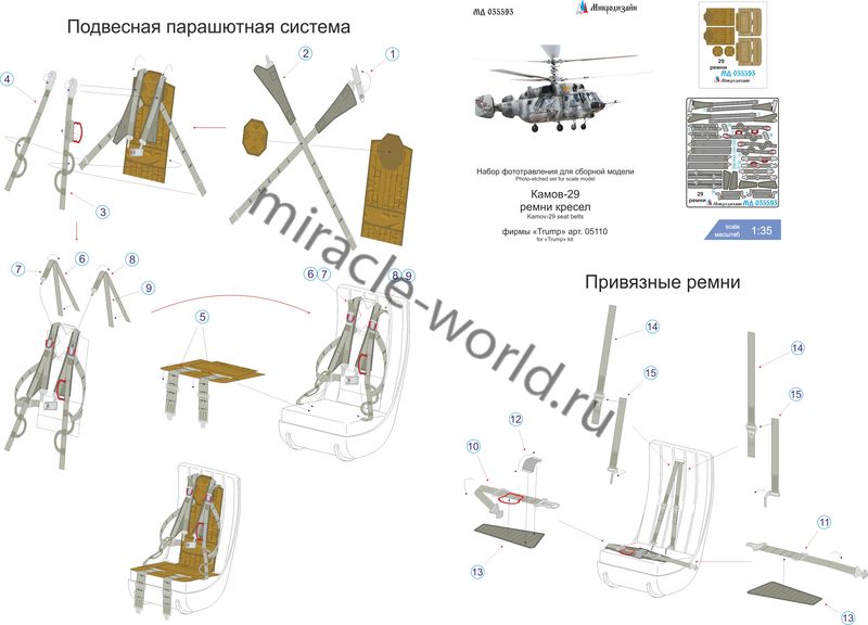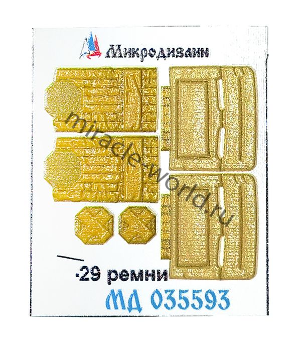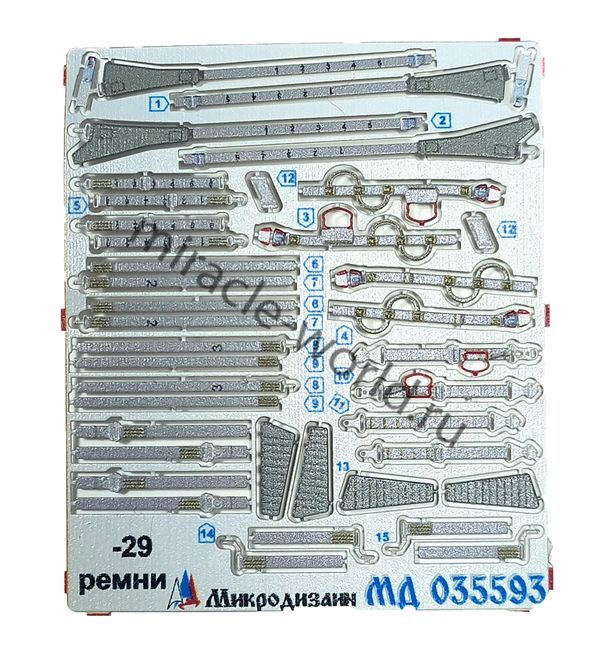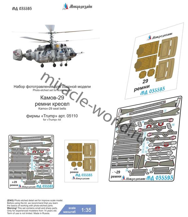 Микродизайн 035593 Набор цветного двустороннего фототравления ремней для вертолета Ка-29 от Trumpeter. Масштаб 1:35, Материал: латунь 0,17 мм, винил. Набор комплектуется пластиной цветного двустороннего фототравления с нанесением размерных меток на лицевую и тыльную части ремня и полноцветной инструкцией. Количество уникальных деталей 18. Уровень сложности: средний.