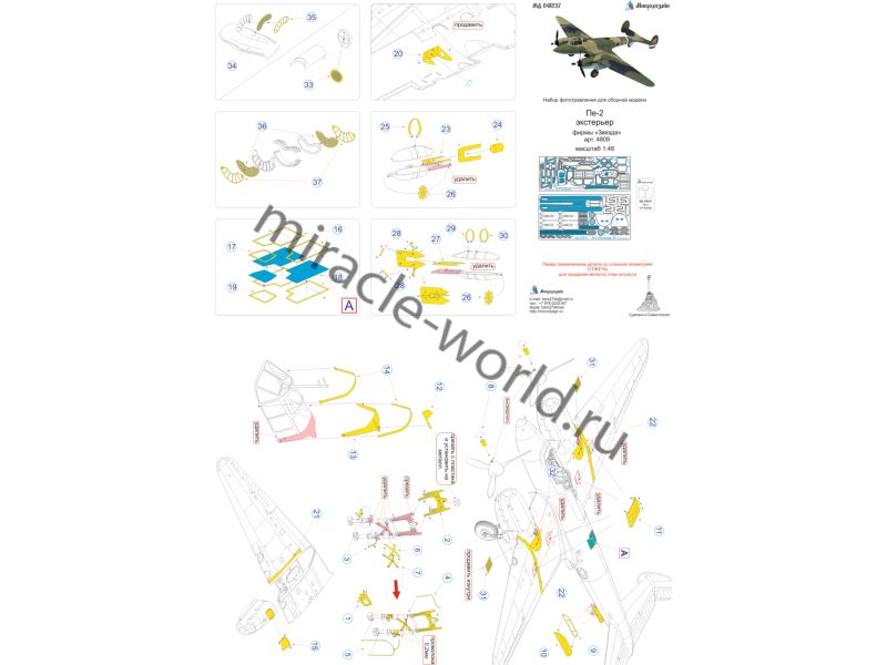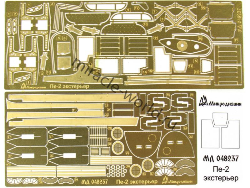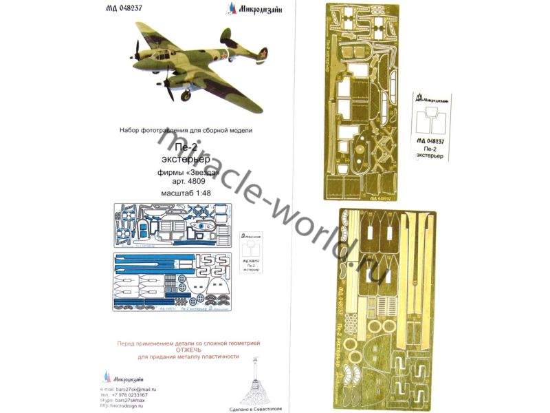 МД 048237 Набор фототравления Пе-2 экстерьер от Звезды. Масштаб 1:48, Материал: латунь 0,17 мм., 0,12 мм. Набор комплектуется 2 пластинами фототравления, пленкой и полноцветной инструкцией. Количество уникальных деталей 37. Уровень сложности: средний.