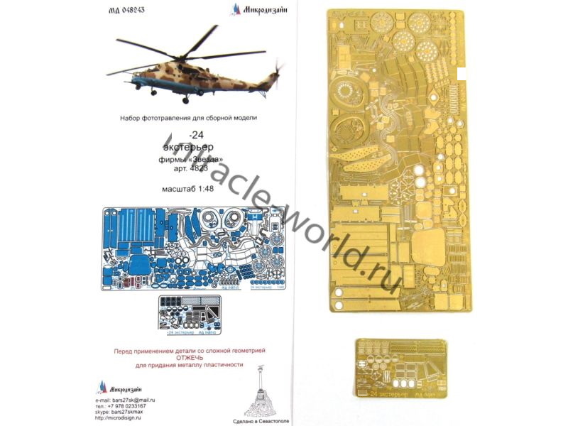 МД 048243 Набор фототравления на вертолет М тип 24 (экстерьр) от Звезды. Масштаб 1:48, Материал: латунь 0,17 мм, 0,12 мм. Набор комплектуется 2 пластинами фототравления и полноцветной инструкцией. Количество уникальных деталей 112. Уровень сложности: средний.