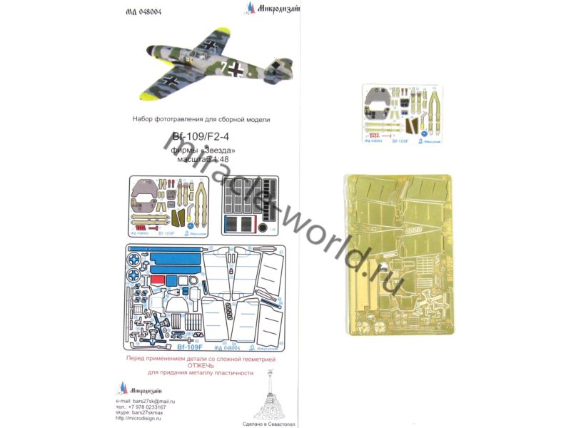 МД 048004 Набор фототравления на Bf-109F от Звезды. Масштаб 1:48, Материал: латунь 0,15 мм. Набор комплектуется 3 пластинами фототравления (в том числе одной цветной пластиной приборной доски, ремней) и полноцветной инструкцией. Количество уникальных деталей 47. Уровень сложности: средний.