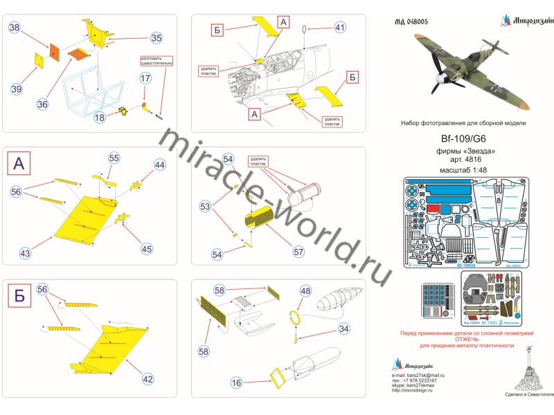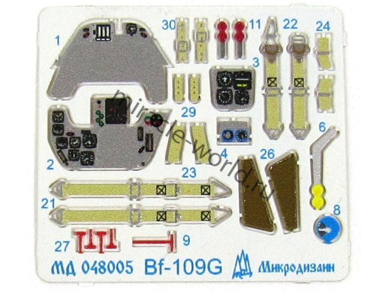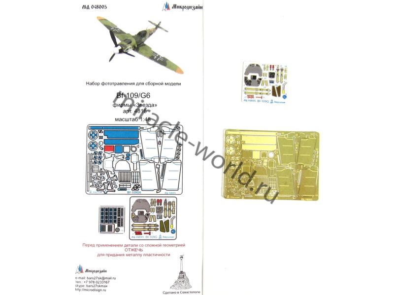 МД 048005 Набор фототравления на Bf-109G6 от Звезды. Масштаб 1:48, Материал: латунь 0,15 мм. Набор комплектуется 3 пластинами фототравления (в том числе одной цветной пластиной приборной доски, ремней) и полноцветной инструкцией. Количество уникальных деталей 47. Уровень сложности: средний.