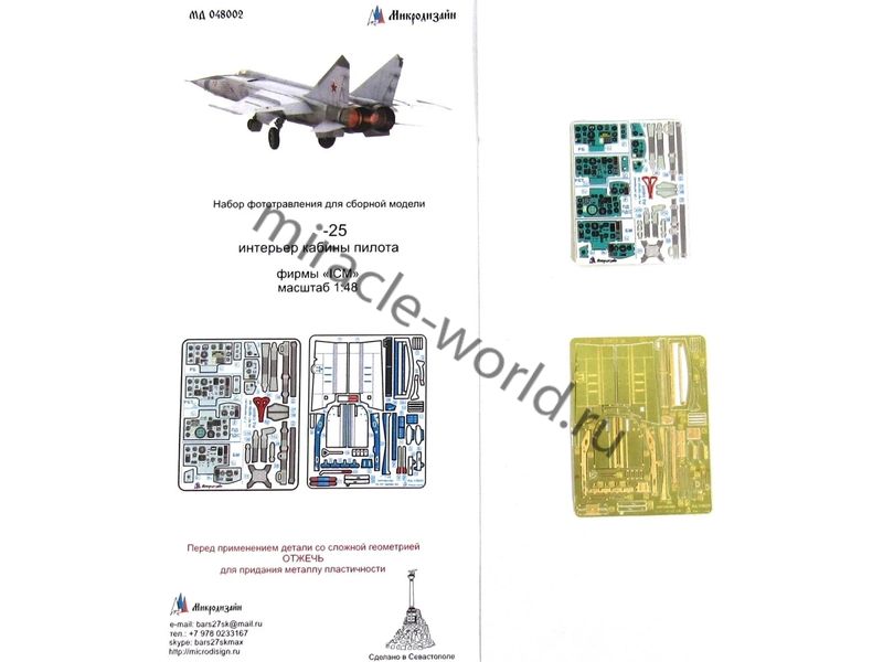 МД 048002 Набор фототравления на МиГ-25 РБ, РБТ, ПД/ПДС, БМ цветной интерьер от ICM. Масштаб 1:48, Материал: латунь 0,15 мм. Набор комплектуется 2 пластинами фототравления (в том числе цветной платиной объемных приборных досок) и полноцветной инструкцией. Количество уникальных деталей 42. Уровень сложности: средний.