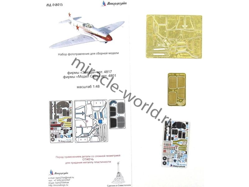 МД 048015 Набор фототравления на Як-1Б от Звезды, Аккурат Миниатюр, Модел Свит. Масштаб 1:48, Материал: латунь 0,15 мм. Набор комплектуется 3 пластинами фототравления (в том числе одной цветной пластиной приборной доски, ремней) и полноцветной инструкцией. Количество уникальных деталей 71. Уровень сложности: средний.