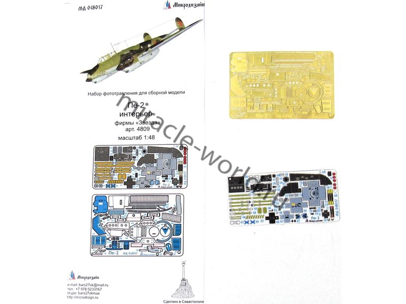 МД 048017 Набор фототравления на кабину Пе-2 от Звезды. Масштаб 1:48, Материал: латунь 0,15 мм. Набор комплектуется 2 пластинами фототравления (в том числе одной цветной пластиной приборной доски, ремней) и полноцветной инструкцией. Количество уникальных деталей 88. Уровень сложности: средний.