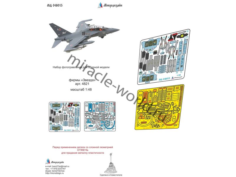 МД 048013 Набор фототравления на Як-130 от Звезды. Масштаб 1:48. Материал: латунь 0,15 мм. Набор комплектуется 2 пластинами фототравления (в том числе одной цветной пластиной приборной доски, ремней) и полноцветной инструкцией. Количество уникальных деталей 54. Уровень сложности: средний.