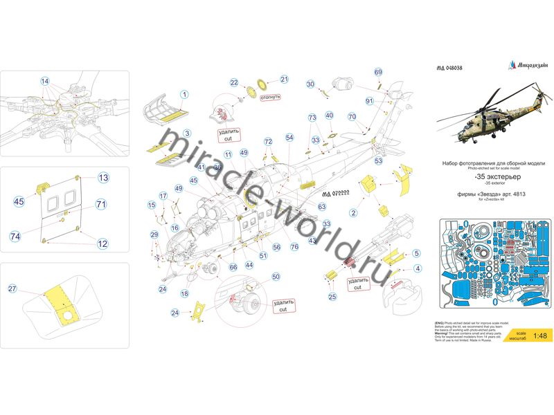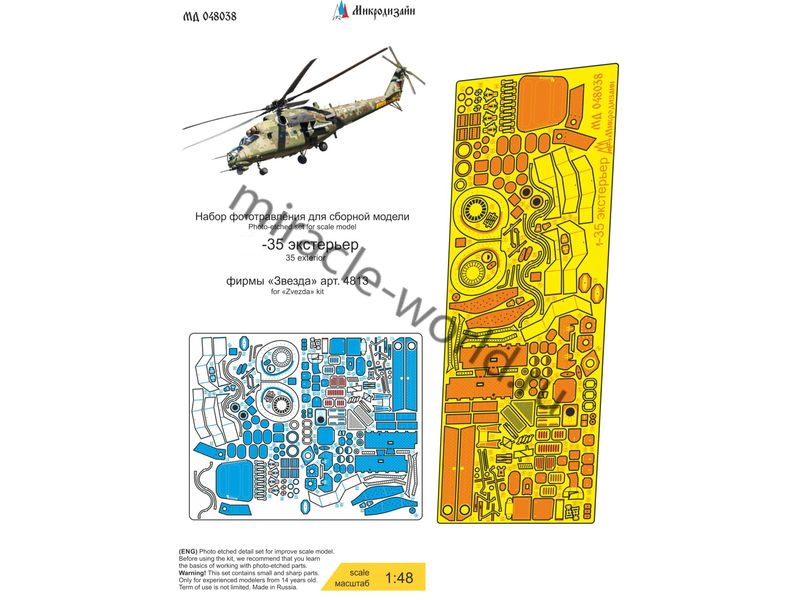 МД 048038 Набор фототравления на вертолет М тип 35 (экстерьер) от Звезды. Масштаб 1:48, Материал: латунь 0,17 мм. Набор комплектуется пластиной фототравления и полноцветной инструкцией. Количество уникальных деталей: 90. Уровень сложности: средний.