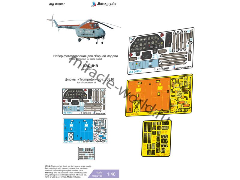 МД 048047 Набор фототравления на вертолет М тип 4 (кабина) от Trumpeter. Масштаб 1:48, Материал: латунь 0,17 мм, мельхиор 0,12 мм. Набор комплектуется 3 пластинами фототравления (в том числе пластиной цветного фототравления приборных досок) и полноцветной инструкцией. Количество уникальных деталей 37. Уровень сложности: средний.