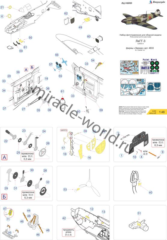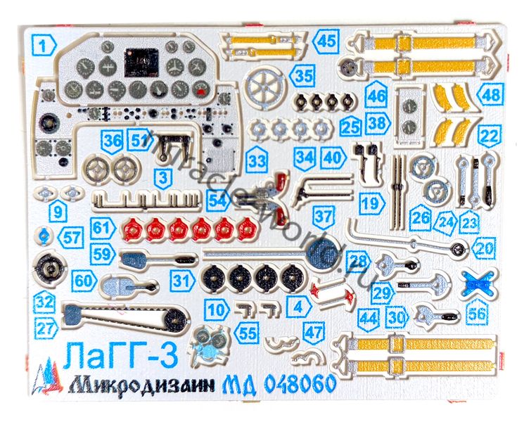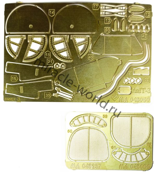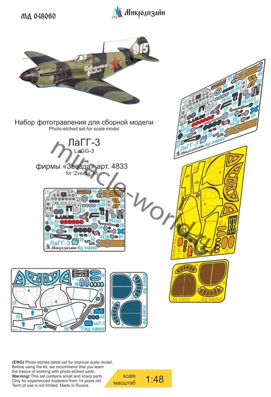 Микродизайн 048060 Набор цветнонго фототравления на ЛаГГ-3 от Звезды. Масштаб 1:48. Материал: латунь 0,15 мм. Набор комплектуется 3 пластинами фототравления (в том числе цветной платой интерьера кабины) и полноцветной инструкцией. Количество уникальных деталей 71. Уровень сложности: средний.