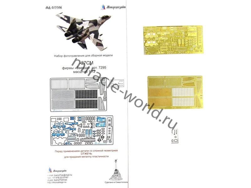 МД 072206 Набор фототравления для сборной модели Су-27СМ от Звезды (арт.7295). Масштаб 1:72. Материал: латунь 0,17 и 0,13 мм. Набор комплектуется 2 пластинами фототравления, 1 пленкой ИЛС и цветной инструкцией.