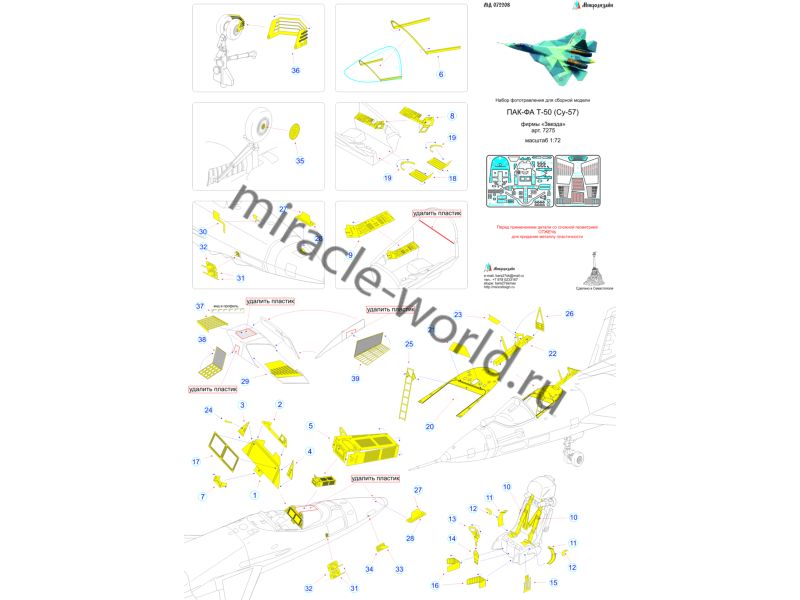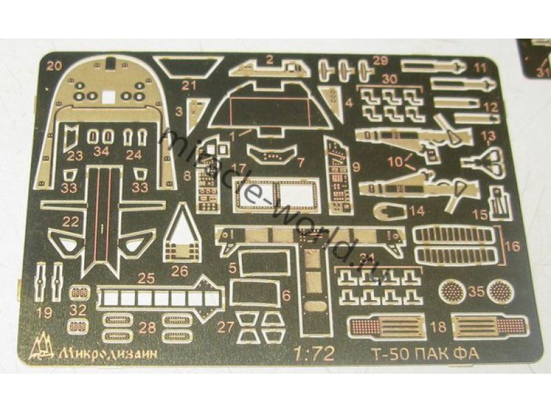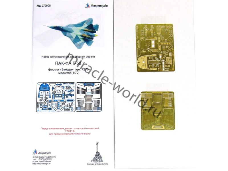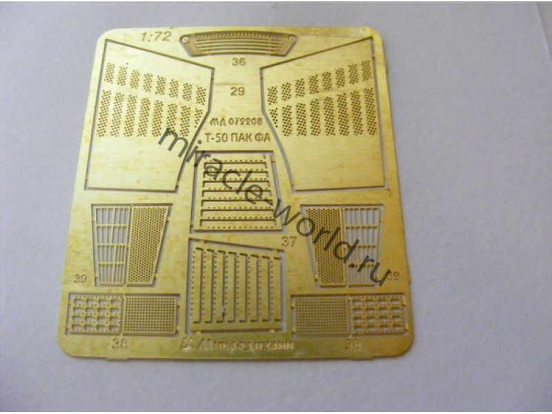 МД 072208 Набор фототравления для сборной модели ПАК-ФА (Т-50) от Звезды (арт.7275). Масштаб 1:72. Материал: латунь 0,17 мм. Набор комплектуется 2 пластинами фототравления, 1 пленкой ИЛС и цветной инструкцией. Количество деталей - 39. Уровень сложности - средний.