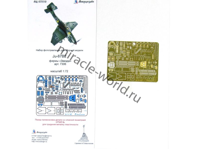 МД 072210 Набор фототравления для сборной модели Ju-87B2 от Звезды (арт.7306). Масштаб 1:72. Материал: латунь 0,17 мм. Набор комплектуется пластиной фототравления и цветной фотоинструкцией. Уровень сложности - простой.