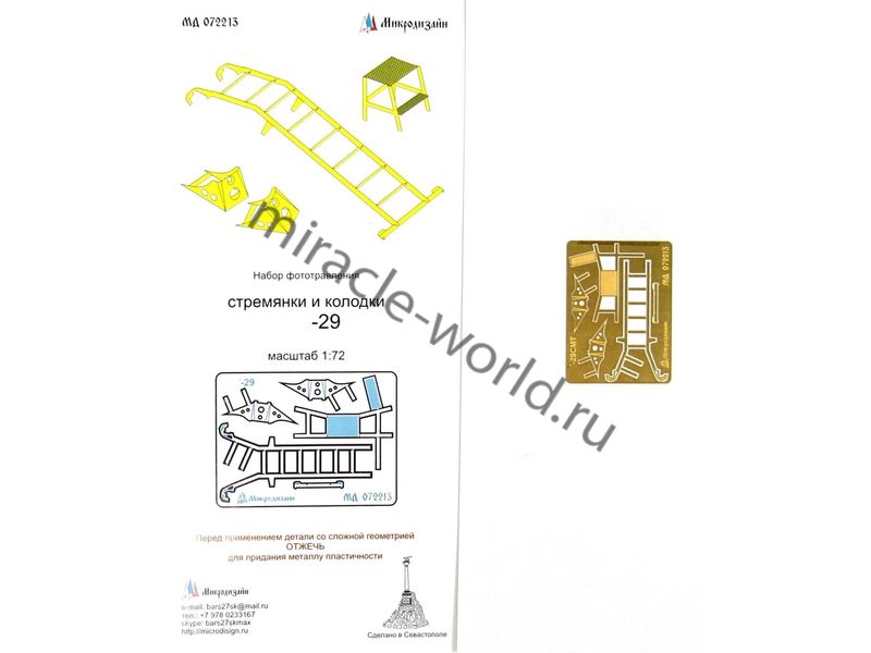 МД 072213 Набор фототравления стремянки и колодок на МиГ-29СМТ. Масштаб 1:72. Материал: латунь 0,17 мм. Уровень сложности - простой. Количество уникальных деталей - 4.