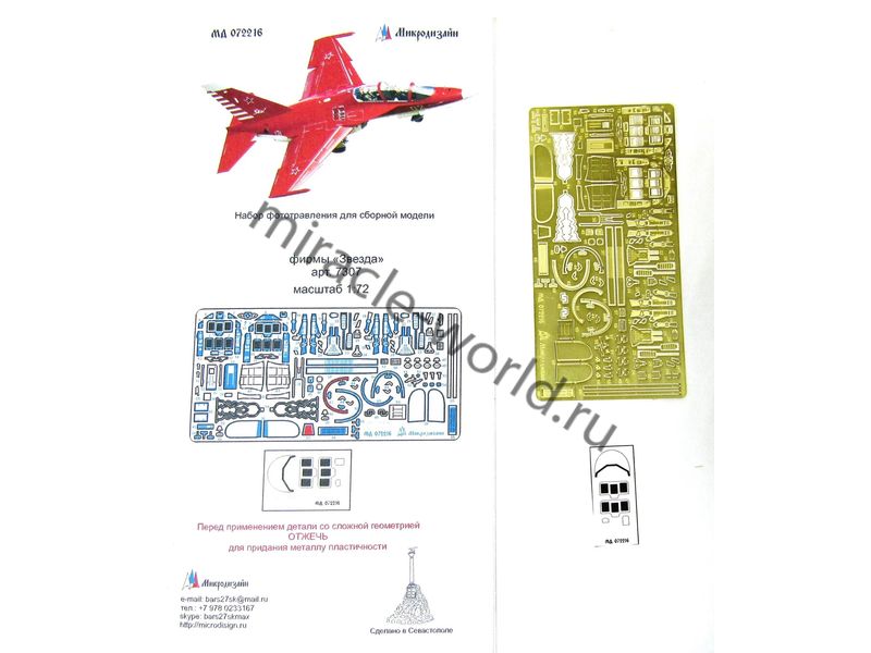 МД 072216 Фототравление для модели Як-130 от Звезды. Масштаб 1:72. Материал: латунь 0,15 мм. Количество деталей: 67 шт. Набор комплектуется платой фототравления, пленкой и цветной инструкцией. Уровень сложности - средний.