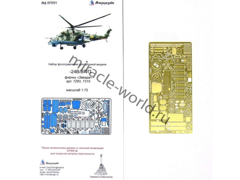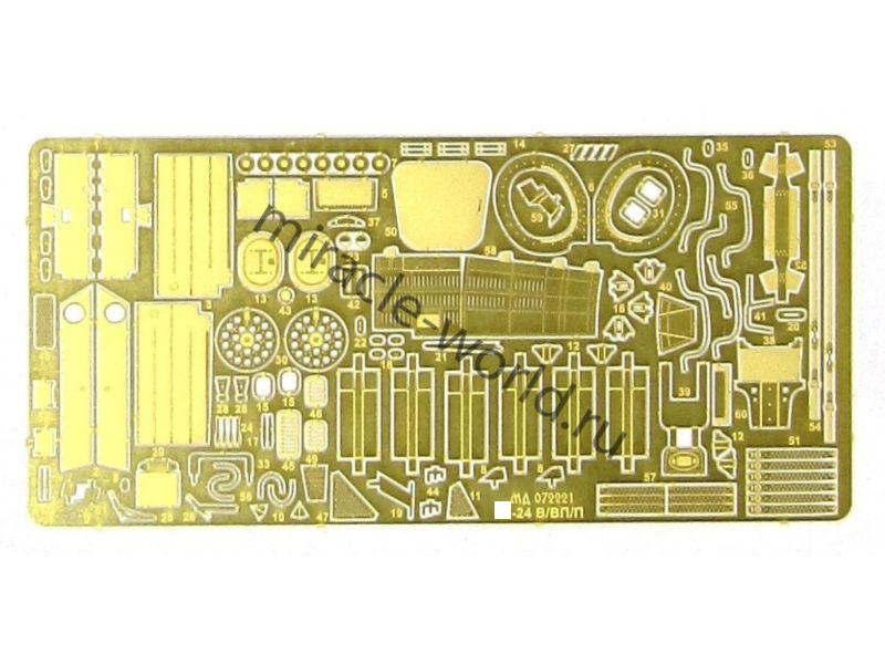 МД 072221 Набор фототравления вертолета М тип 24 В/ВП/П (экстерьер) от Звезды. Масштаб 1:72. Набор комплектуется платой фототравления и цветной инструкцией. Количество уникальных деталей 61 шт. Уровень сложности - средний.