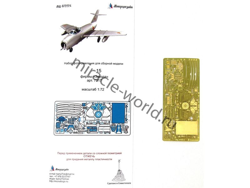 МД 072224 Набор фототравления для сборной модели МиГ-15 от Звезды. Масштаб 1:72. Материал: латунь 0,17 мм. Набор комплектуется пластиной фототравления и цветной инструкцией. Уровень сложности - средний. Количество уникальных деталей - 65 шт.