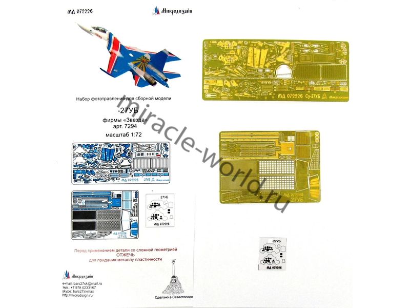 МД 072226 Набор фототравления на Су-27УБ от Звезды. Масштаб 1:72. Материал: латунь 0,17 и 0,14 мм. Набор комплектуется 2 пластинами фототравления, пленкой приборных досок и цветной инструкцией. Уровень сложности - средний.